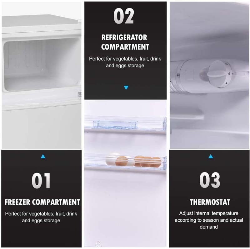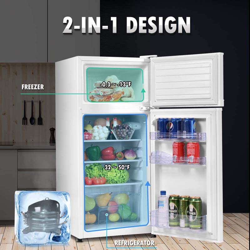 - 2 Door Dual-Zone Design: Double Door Design, freezer compartment can be used for storing frozen foods or making Ice cubes. The door offers a spot for your favorite canned beverages. There are fresh fruits you like to eat in the drawer, sweet ice cream in the frozen area.