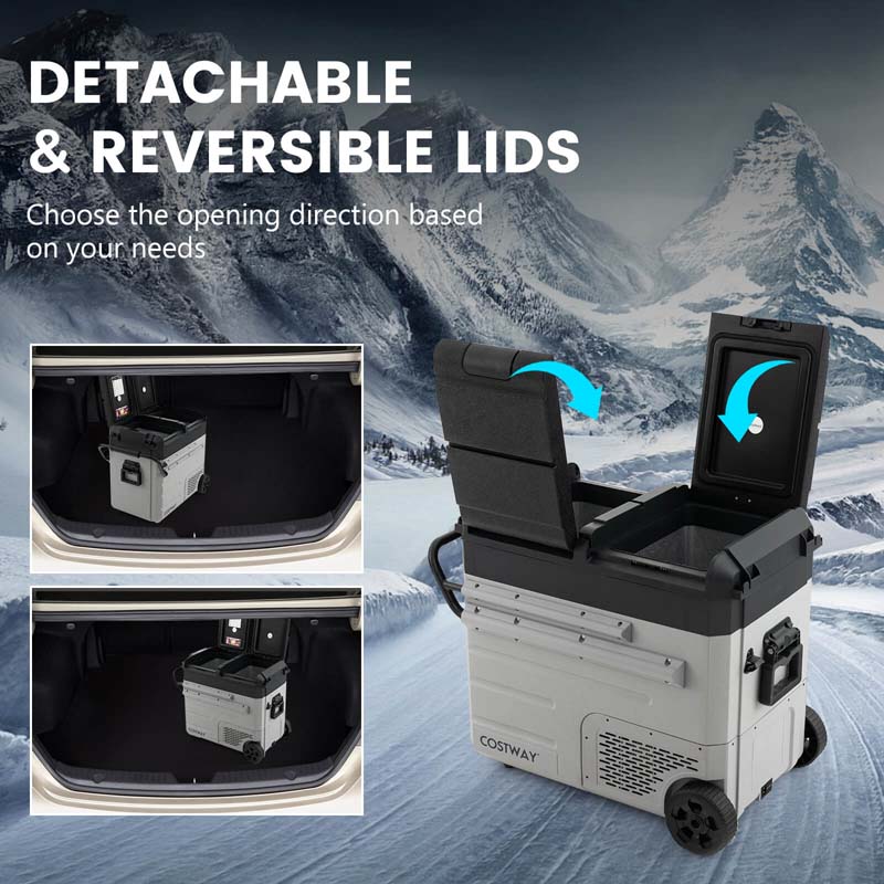 - Portable Design & Reversible Lids: Equipped with a retractable pull handle and 2 anti-wear big wheels, this car refrigerator is easy to move and transport. Moreover, the detachable and reversible lids of this car fridge allow you to choose the opening direction based on your needs.