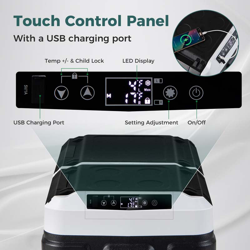 Featuring dual-zone design with independent temperature control from -4℉ to 68℉ (-20℃ to 20℃), this fridge ensures perfect storage conditions for a variety of items, such as beverages, fruits, seafood, meat, vegetables, skincare, etc. Equipped with a powerful compressor, this car freezer can quickly cool down to 32℉ in just 10 minutes. Users can enjoy versatile power supply options with included 12/24V DC and 100-240V AC power cords, suitable for home and outdoor use in vehicles, boats, trucks, and more.