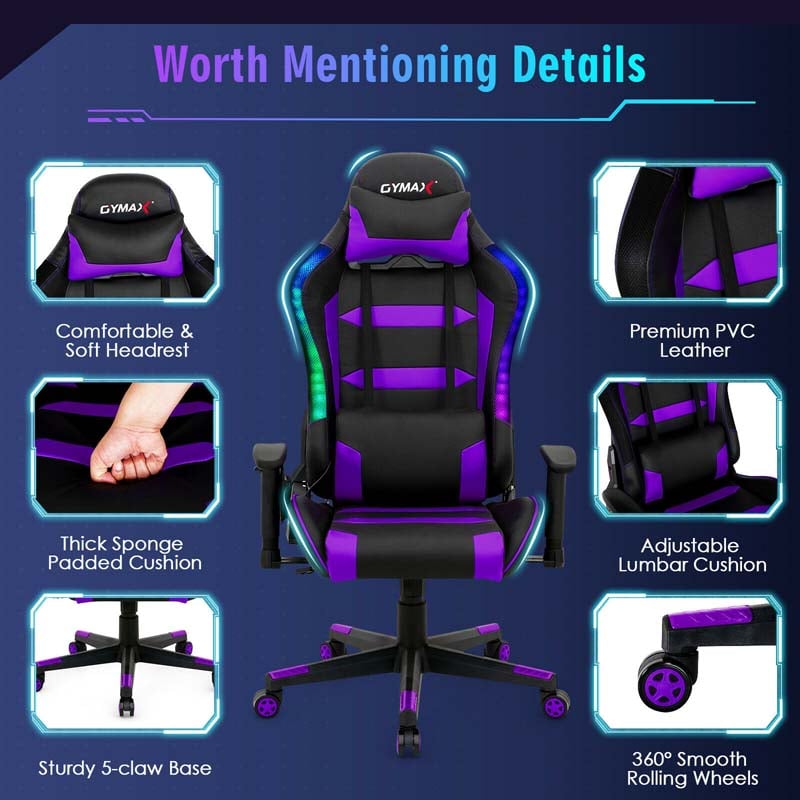 This ergonomic gaming chair with RGB lights is designed for video gaming players! It comes with dynamic LED light effect for a richer game atmosphere. You can choose lighting modes, colors and brightness with the remote control with ease. With a high-back ergonomic design, adjustable lumbar support, thick sponge padded cushion and removable headrest, this gaming chair will give you an ultra-comfortable sitting experience, whether you're playing games, working, studying and more. Besides, this fully adjustable chair can perfectly meet all your needs in daily use. The seat height can be adjusted from 18.5" to 22.5"; the backrest can be tilted from 90° to 155° for various tasks; the armrests can be lifted up/lowered down and turned left/right for extra comfort. The heavy duty 5-claw base and sturdy gas rod ensure excellent stability and load capacity. The smooth and waterproof PVC surface is easy to clean with wet cloth. With 5 smooth rolling casters, you can move the chair from room to room easily and quietly.